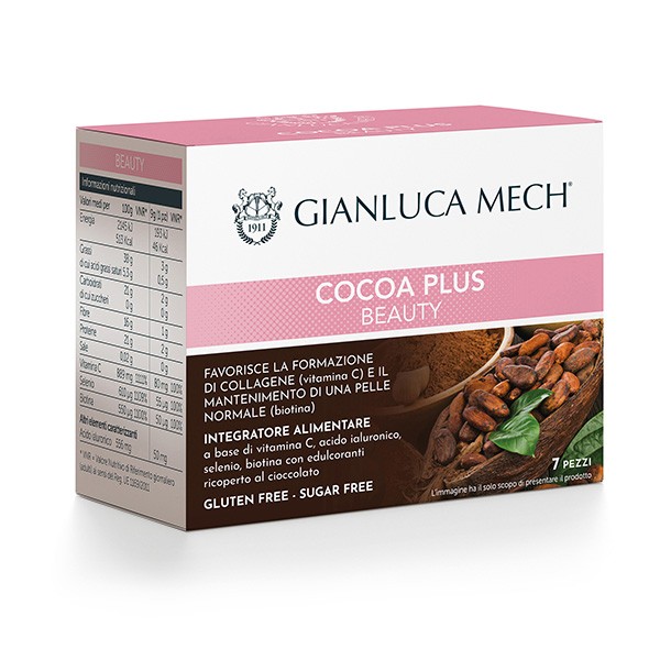 Integratore alimentare a base di cioccolato con acido jaluronico, biotina, selenio e vitamina C che favorisce la formazione del collagene.